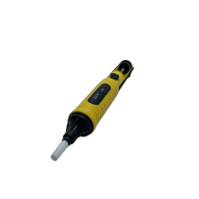 Sugador de solda ideal para substituição de componentes em placas de circuito impresso e pequenos protótipos. Com ele basta pressionar o embolo superior e pressionar o botão lateral sobre a solda aquecida para removê-la através de sucção.