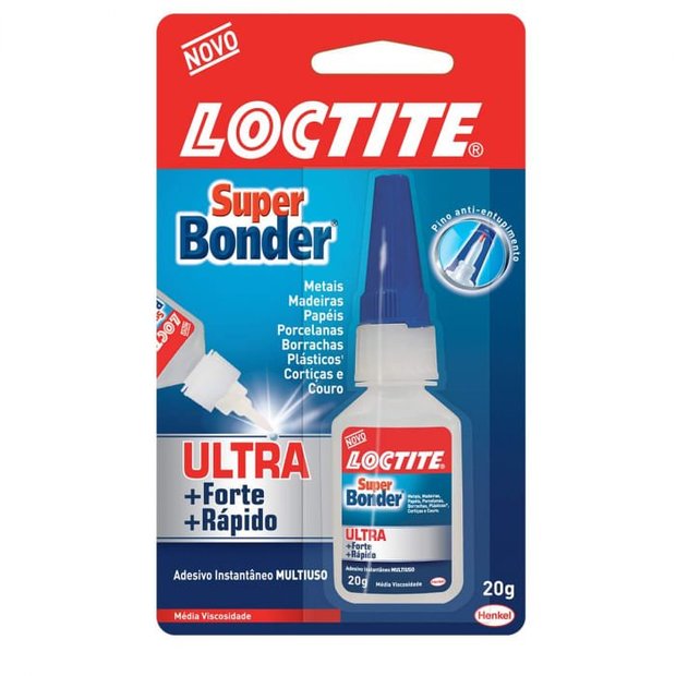 Super bonder ultra mais forte e rápido, resistente á temperaturas (de -54ºC até 120°C), para uso profissional. Alta resistência a impactos possui cura transparente e instantânea, pino anti-entupimento e sistema abre fecha em meia volta. Pode ser usado em metais, madeiras, papéis, porcelanas, borrachas, plásticos (exceto polietileno e polipropileno), cortiças e couro. Marca: Loctite.