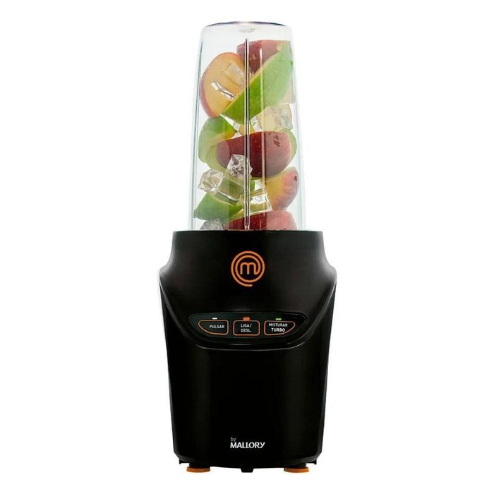 Super Liquidificador E Processador Mallory Blender Masterchef Preto E Laranja 127VTransforme as suas receitas em fonte de saúde e bem-estar com praticidade: bata frutas, verduras e legumes com folhas, cascas, talos e até triture cubos de gelo.Sua superpotência de 1.000W e super faca em Aço Inoxidável de 6 lâminas garantem a ultra extração dos nutrientes para uma alimentação saudável que você leva para onde for nos copos de tritan ultra resistentes com tampa em squeeze - de 400ml ou 1L!Agora ficou muito mais fácil fazer vitaminas, shakes, smoothies, sucos, molhos, caldos, recheios e o que mais sua imaginação mandar, inclusive o cafezinho moído na hora!