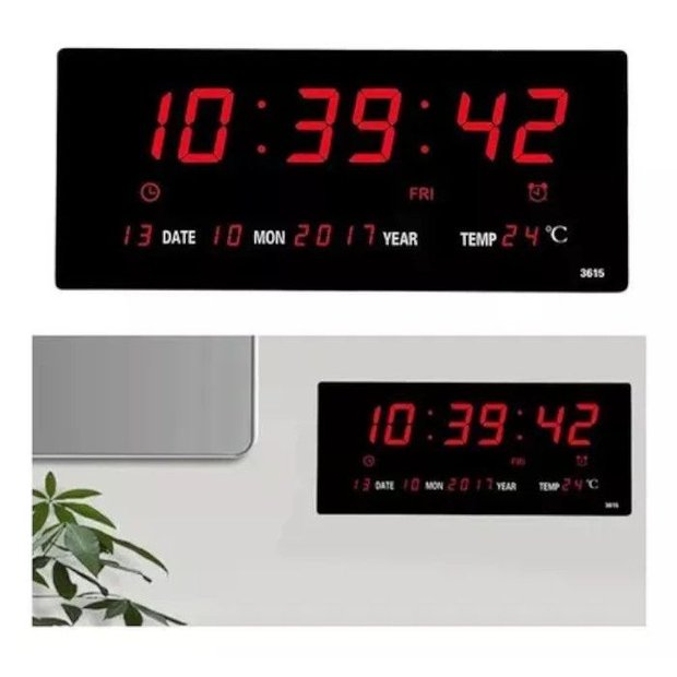 Relógio De Parede LED DigitalCaracterísticas do produto:Excelente nitidezCor dos Leds: VermelhoTensão da fonte: 110v / 220v (Bivolt)Ajuste fácil, através dos botões na parte inferior traseiraMarca a hora/minutos/segundos, dia do mês/mês/ano, dia da semana, temperaturaHora: 12/24hSistema eletrônico de quartzPossui bateria interna para manter memória em caso de falta de energia ( bateria não incluida )Visor de led proporciona visibilidade nítida no escuroCor do Relógio: PretoDimensões aproximadas do produto:Comprimento: 36 cmAltura: 15 cmLargura: 3 cmItens Inclusos:1 Relógio com visor de LED1 Fonte de energia (bivolt)