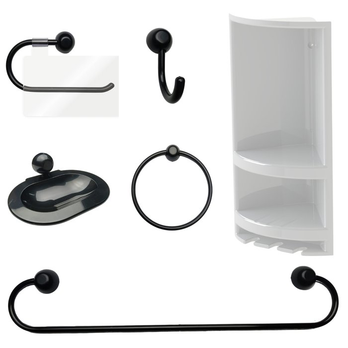 Suporte de Canto Cantoneira Porta Shampoo Branco + Kit para Banheiro Redondo 5 Pçs Preto