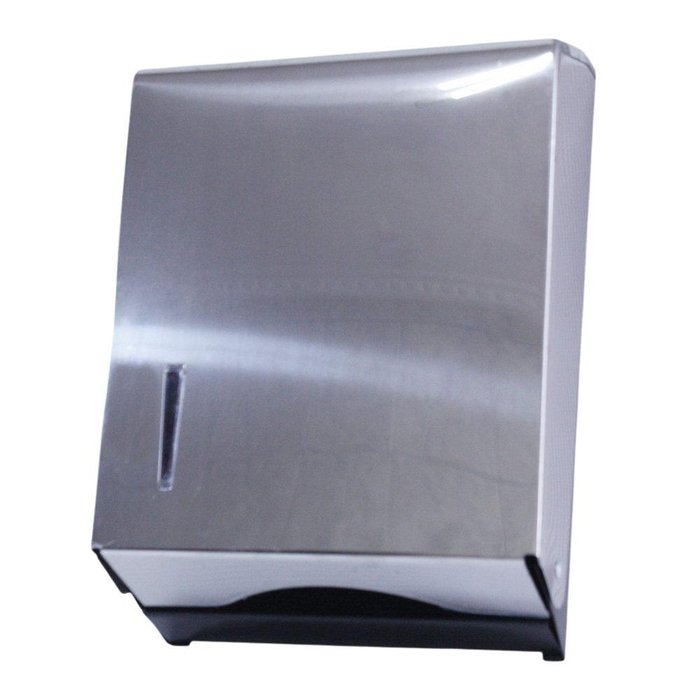 Dispenser de papel toalha ou toalheiro em aço inox, com excelente qualidade e alto luxo com design sofisticado e com estrutura reforçada para ambiente público, com trava de segurança com chave. Indicado para ambientes como, hospitais, consultórios, restaurantes, clínicas, industrias, shoppings, hotéis, vestiários, e para outros ambientes. Com capacidade para 500 folhas de 2 ou 3 dobras, sem porta cadeado. Pintura epóxi.