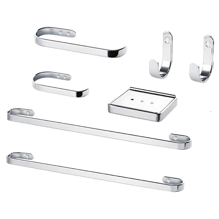 Medidas Cabide Altura : 7 cm Largura : 1,6 cm Comprimento : 5 cm Medidas Porta toalha de banho Altura :1,6 cm Largura : 60 cm Comprimento : 5 cm Medidas Porta toalha de rosto Altura : 5 cm Largura : 18 cm Comprimento : 5 cm Kit de acessórios para banheiro 6 peças