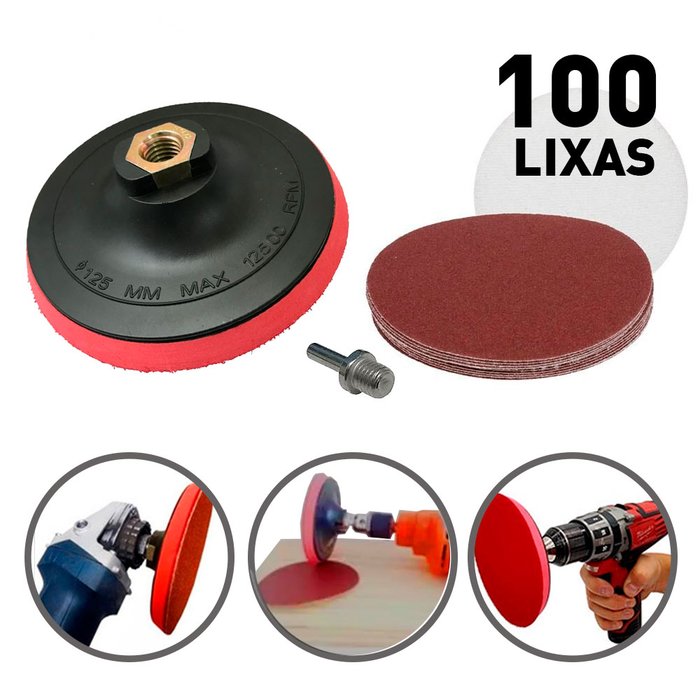 Suporte para Furadeira e Esmerilhadeira 125mm + 100 Disco Lixa Kit com Suporte para disco de lixa 125mm encaixe M14 para lixadeiras e politrizes. Acompanha adaptador para uso em furadeiras e parafusadeira. Kit com 100 lixas de diversar gramaturas (veja abaixo). - Marca: MTX - Diâmetro: 125mm - Encaixe: M14 - Acompanha adaptador para furadeira - Pode ser utilizada para boinas ou lixas de 125mm (5”) com base aderente (pluma) - Kit com 100 lixas, sendo: - 10 Discos de Lixa G24 - 10 Discos de Lixa G36 - 10 Discos de Lixa G40 - 10 Discos de Lixa G60 - 10 Discos de Lixa G80 - 10 Discos de Lixa G100 - 10 Discos de Lixa G120 - 10 Discos de Lixa G150 - 10 Discos de Lixa G180 - 10 Discos de Lixa G220 - Peso bruto: 130 gramas - Garantia: 90 dias
