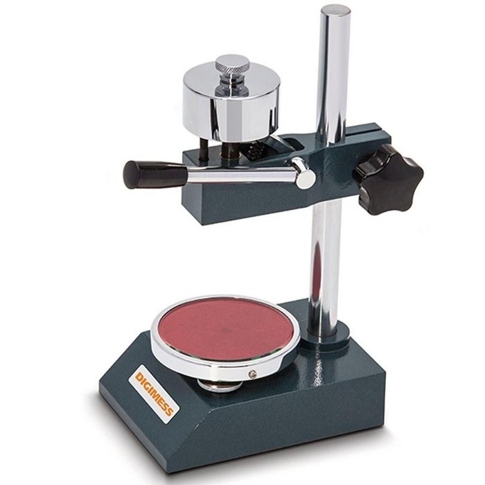 Suporte para Durometro Shore A - Analógico Ref. 400.143 Descrição geral - Suporte de bancada para durômetro Shore A, para garantir carga constante (1 Kg) e perpendicularidade do instrumento em relação ao corpo de prova; Marca: DIGIMESS;
