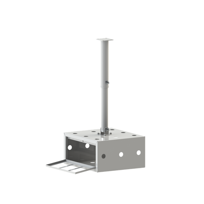 SOBRE O PRODUTO: O MULTI-P-GAIOLA é um suporte de teto para projetor com grade e porta de segurança para fechamento e segurança do equipamento (cadeado não incluso). É possível ajustar a altura de 50,0 até 80,0cm. Possui sistema de fixação UNIVERSAL sendo compatível com os projetores do mercado que possuem ao menos 3 pontos para fixação. O seu conjunto de molas permite que o ajuste da inclinação seja milimétrico. Junto com o suporte vem uma capa decorativa para a base que esconde os parafusos quando instalada na laje ou faz o acabamento do forro. A passagem dos cabos pode ser feita por dentro dos tubos do suporte garantindo uma instalação perfeita!