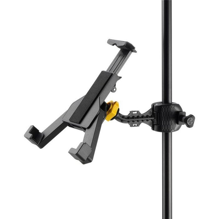 O suporte para Tablet Hercules DG305B, acomoda tablets de 7 a 12 polegadas com até 23,5 cm de largura e 28,0 cm de comprimento. Acompanha clamp para tubo de pedestal de microfone e base para mesa com ventosa.