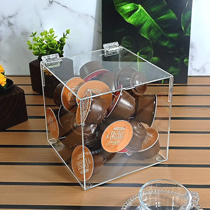Sua caixa Porta Capsula é produzida em 100% Acrílico cristal virgem, ou seja, não é material reciclado. O que garante ainda mais a qualidade de nosso produto.