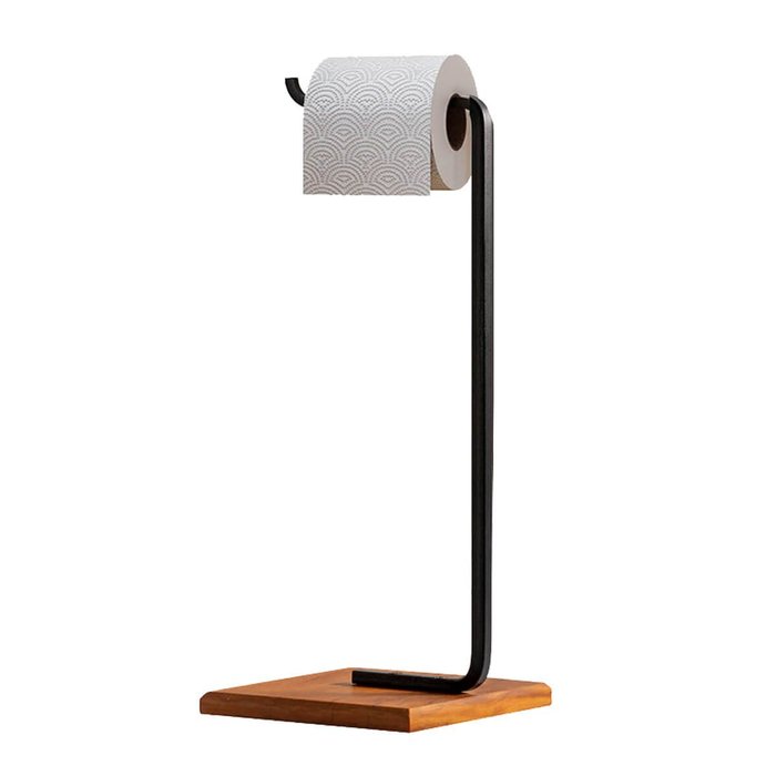 Suporte Porta Papel Higiênico de Chão Preta para Banheiro com Base em Madeira Peroba - ÉdeCasaMóveis