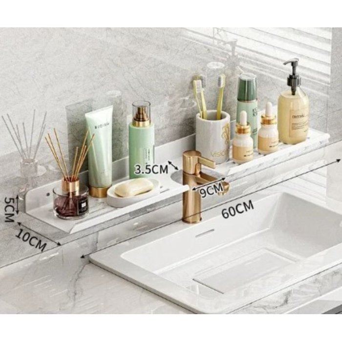 Linda Prateleira suspensa para lavatório, sendo utilizada para otimizar o espaço em cima da pedra do lavatório. acondicionando assim saboneteiras e produtos de hihiene.