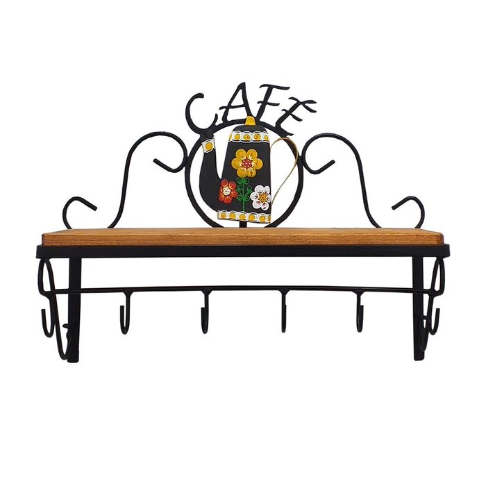 Produto fabricado com materiais de qualidade, possui estrutura em ferro com acabamento em pintura eletrostática na cor preto (resistente à ferrugem e arranhões superficiais), prateleira em madeira de reflorestamento tratada, com acabamento em cera de carnaúba e selador, deixando a madeira impermeabilizada (não mancha em contato com a água), facilitando sua limpeza e higienização. Possui 06 ganchos fixos para pendurar colheres grandes, canecas, xícaras ou panos de pratos. O aplique decorativo no formato de bule é fabricado em madeira maciça com pintura artesanal utilizando tinta látex e tinta esmalte.