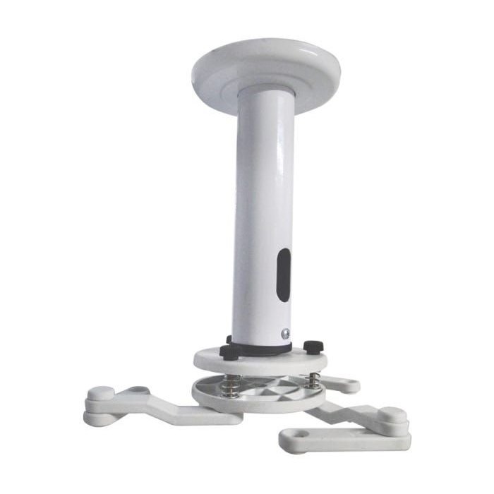 Suporte de teto para projetor linha standard; Possui hastes articuláveis; Tubo de aço carbono com pintura eletrostática a pó; Permite passagem de cabos no interior do tubo; Permite fixação em laje e teto de gesso; Possui acabamento de teto; Peso: 1kg; Atende a furações dispostas dentro de uma circunferência máxima de 34cm; Comprimento do tubo: 20cm. Permite giro de 360º ; Inclinação de até 15°; Carga máxima:10kg; Acompanha manual de instruções e kit de parafusos para instalação;