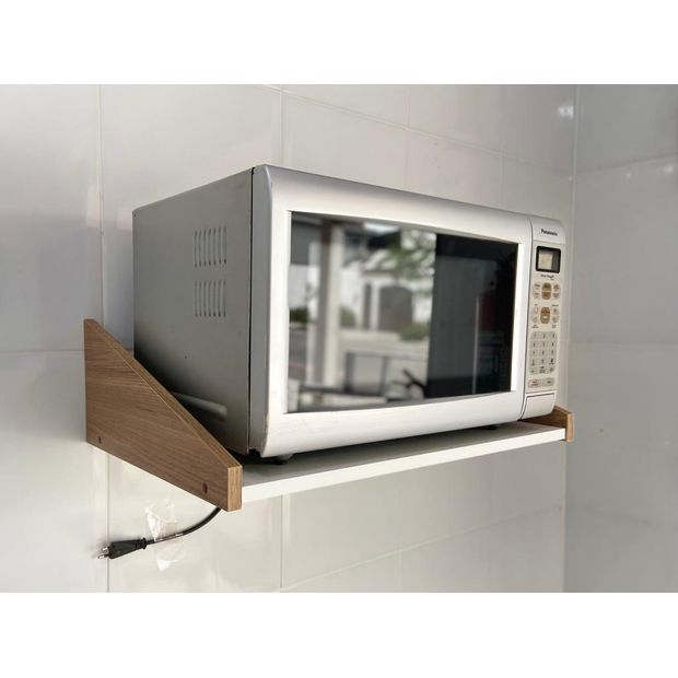 Novo design de Suporte para Microondas de até 35 Litros. Confeccionado 100% em MDF branco com laterais madeirado, de primeira qualidade. Serve também para forno elétrico(consultar medida), Notebook, impressoras e Mesa de Cabeceira suspensa. Para não ceder com o peso, instalamos fixador metálico reforçado e Galvanizado.