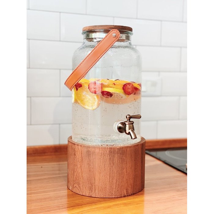 Suqueira de vidro e bambu com alça de couro com capacidade de 5,6 litros. Possui torneira removível para fácil limpeza.