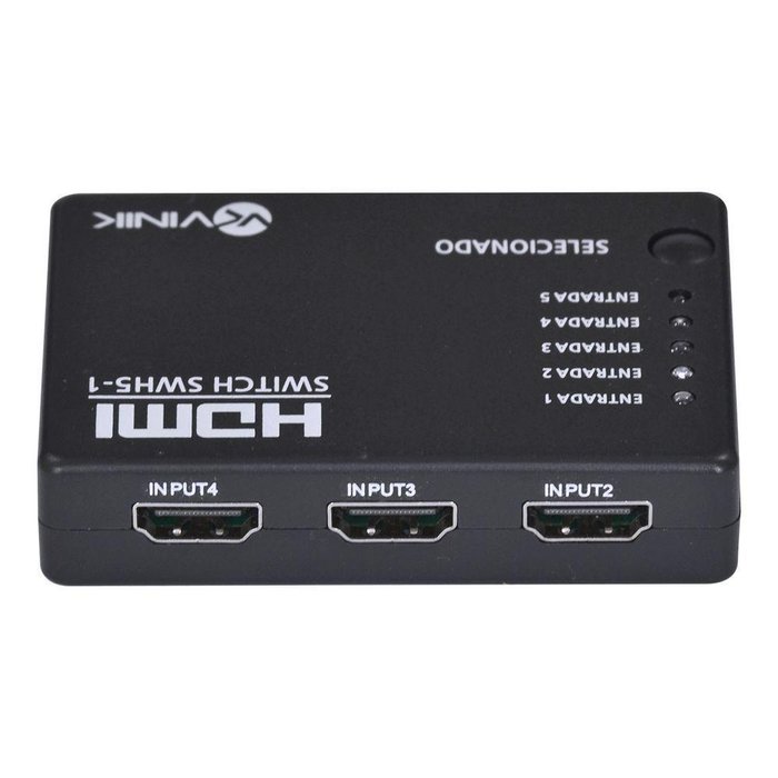 Chega de ter que ficar trocando cabo HDMI entre Notebook, Câmera, Vídeo Game, Home Theater e Decoder. Conheça o novo SWITCH HDMI VINIK, com este aumento do número de equipamentos em alta definição o SWITCH HDMI VINIK é uma excelente solução para TVs que possuem apenas uma entrada HDMI ou quando as entradas forem insuficientes ou de difícil acesso para conectar todos os equipamentos. O SWITCH HDMI VINIK conecta até 5 equipamentos com saída HDMI a uma única entrada HDMI da sua televisão, sem perder a qualidade de som e imagem.