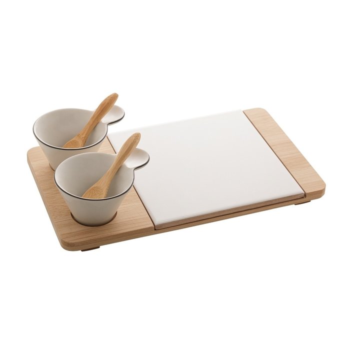 Esse lindo Conjunto Tábua para Queijos e Petiscos vai servir as suas visitar com mais conforto e estilo! Torne aquele dia de petiscos mais fácil e sofisticado. Composto por uma tábua de bambu com pedra de cerâmica, ideal para cortar e servir queijos, e duas molheiras de cerâmica com colher de madeira, para servir molhos e petiscos.