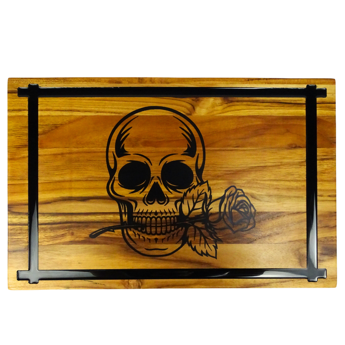 Ao usar a Tábua de Madeira Teca com Resina, você sentirá a sensação única de estar manipulando uma peça que é ao mesmo tempo funcional e uma verdadeira obra de arte. O grande desenho de uma caveira em resina no centro da tábua traz um toque ousado e moderno, transformando suas experiências culinárias em momentos de pura inspiração.