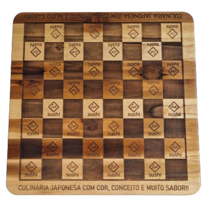 Eleve seu momento sushi com nossa Tabua de Sushi modelo 'Dama' em preciosa madeira de teca. Medindo 40 cm x 40 cm e com uma espessura substancial de 2 cm, esta peça não apenas oferece uma base sólida para sua refeição, mas também é uma obra de arte personalizada. O detalhamento preciso, gravado a laser, confere um toque exclusivo, transformando cada peça em uma expressão única de seu estilo. Aprecie a sofisticação e autenticidade em cada bocado