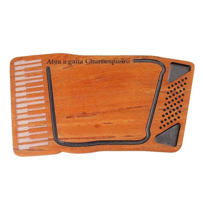 Tábua para Churrasco Modelo Gaita 58x33 (Sanfona) Nada melhor que um bom churrasco, amigos, família e uma boa música para alegrar. Sirva seus convidados no melhor estilo. Com essa tábua você vai surpreender a todos. Produzida em madeira nobre certificada (Angelim). Detalhes em resina nas canaletas, teclas e porta molhos/farofa. Acabamento com óleo mineral e cera de abelha, finalizada com polimento. Por se tratar de produto natural as tonalidades podem variar. Medidas 58cm x 33cm x 3cm - Produzido de forma artesanal, as medidas podem sofrer variações.