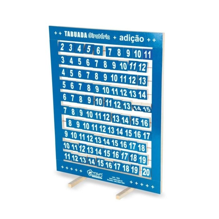 Tabuada de adiçao na vertical com 02 pezinhos giratorios, confeccionada em M.D.F. com 100 quadradinhos que giram para formar os resultados. Moldura na cor azul. Cada quadradinhomede 3 x 3 cm. Medida do quadro: 48 x 38 cm. Medida total da tabuada: 49,2 x 38 cm. Embalagem: Película de P.V.C. encolhível.CE-BRI/ICEPEX - N 00928-96