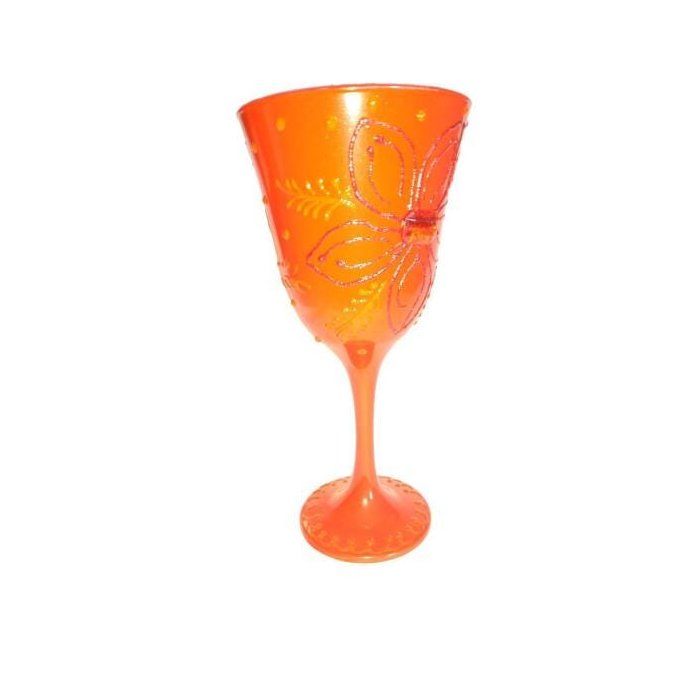 Taça de vidro, pintado de vermelho e decorado a mão com pedras vermelhas de plástico.