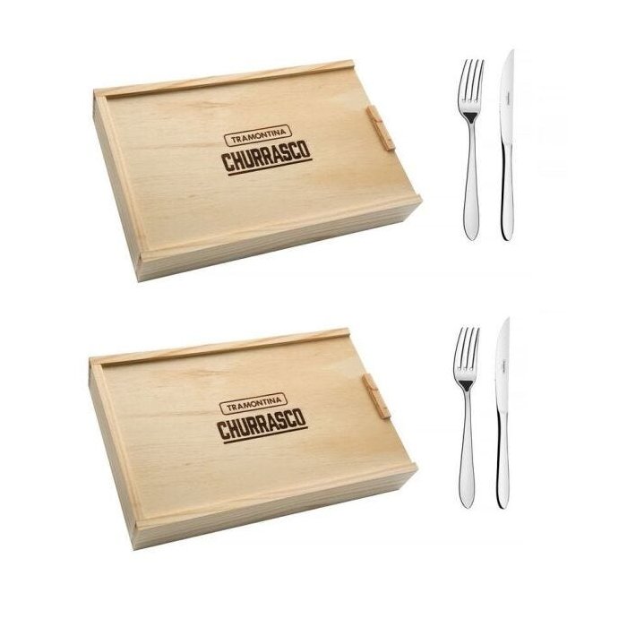 Talher Para Churrasco 16 Peças Satri Tramontina - 66982/614 Descrição: Os talheres da linha Satri proporcionam todo conforto e beleza para seu churrasco. Com dentes polidos na parte interna, formato apropriado para a boca e bordas cuidadosamente arredondadas, os garfos proporcionam todo conforto para os usuários, além da beleza, dada por seu acabamento em alto brilho. As facas do conjunto são totalmente temperadas, o que garante maior durabilidade no fio de corte e maior resistência à corrosão, e por suas características de temperabilidade, não riscam as porcelanas, sem contar que todas as peças são em aço inox, o que já garante alta durabilidade e preservação das características originais por muito mais tempo. Além disso, podem ir à máquina de lavar louças. Material: aço inox. Estojo de madeira pinus. Contém: 8 Facas para Churrasco 8 Garfos para Churrasco Prezado Cliente: Temos todos os produtos dessa linha com excelentes valores. A cor do produto é exatamente a mesma que consta na foto do anúncio. Envio Imediato após a confirmação da Compra. Permanecendo dúvidas estamos à disposição! Ótimas Compras!!! Importante: Use apenas sabão ou detergente e uma esponja macia. Outros tipos de produtos, como palha de aço, poderão riscar ou prejudicar o brilho dos talheres. Enxágue bem cada peça a fim de remover totalmente os resíduos dos produtos de limpeza, que, por serem abrasivos, podem atacar o inox. Sempre que possível, use água quente, pois renova o brilho do talher. Após a lavagem, enxugue imediatamente os talheres, caso contrário, as substâncias químicas da água (cloro) poderão causar manchas. Evite atrito entre os talheres durante o processo de lavagem e no armazenamento, para mantê-los sem riscos. Evite o contato das peças com superfícies quentes. Elas provocam a descoloração do produto. Não guarde os talheres em locais úmidos. A umidade também provoca manchas. Qualquer faca, independentemente de marca, para manter o fio de corte, é fabricada em aço com maior teor de carbono e, por isso, é menos resistente à corrosão. Assim, pedimos uma atenção especial para este artigo, pois estará mais propenso aos problemas citados. Usando máquina de lavar louças: Não carregue em demasia a cesta dos talheres. Separe bem as peças, pois o contato permanente entre as mesmas, durante a secagem, poderá causar manchas. Retire os talheres logo que tenha terminado o ciclo "enxaguar", a fim de que os mesmos sejam secados manualmente. EAN13: 7891116097786 DUN14: 27891116097780 NCM: 8215.20.00 Peso Líquido: 0,4850 kg. Peso Bruto: 0,9100 kg. Metragem: 0,001855 m³. Dimensões Embalagem (Compr. X Larg. X Alt.): 265x 175x 40 mm. Dimensões Produto (Compr. X Larg. X Alt.): 265x 175x 40 mm.