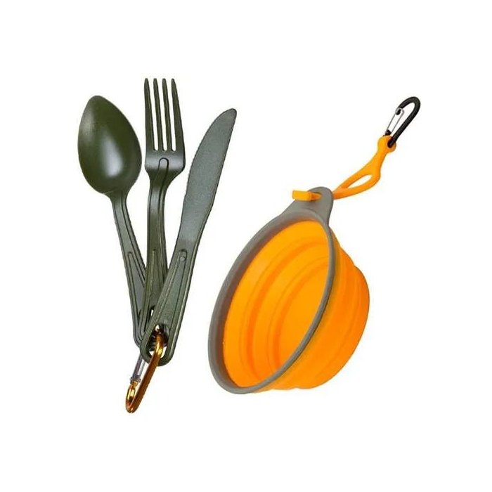 - 1 Conjunto Talheres Camping (Garfo, Faca, Colher e Mosquetão)