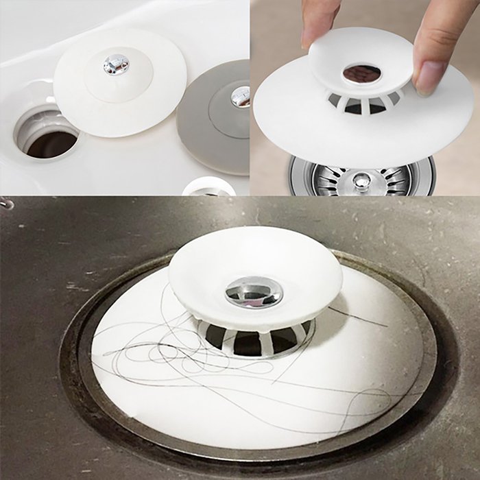 Parada de drenagem de função dupla e coletor de cabelo. Pressione o botão central para permitir o fluxo de água e use como coletor de cabelo. Empurre as bordas viradas para fechar a válvula e usar como uma parada de drenagem. Fácil de cuidar. Simplesmente limpe ou enxague com sabão neutro.