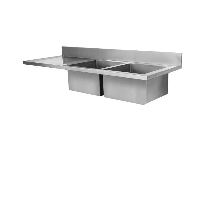 Tampo Pia de 160x70cm, com 2 cubas de 50x40x25cm, totalmente produzido em Aço Inoxidável 201. Contém espelho frontão, responsável pela contenção de respingos de água e demais líquidos na parede. Quando se trata de resistência e durabilidade, os produtos em aço inox são incomparáveis, sendo resistentes a impactos e choques térmicos, não absorvem cheiros, não mancham com facilidade e não criam ranhuras.