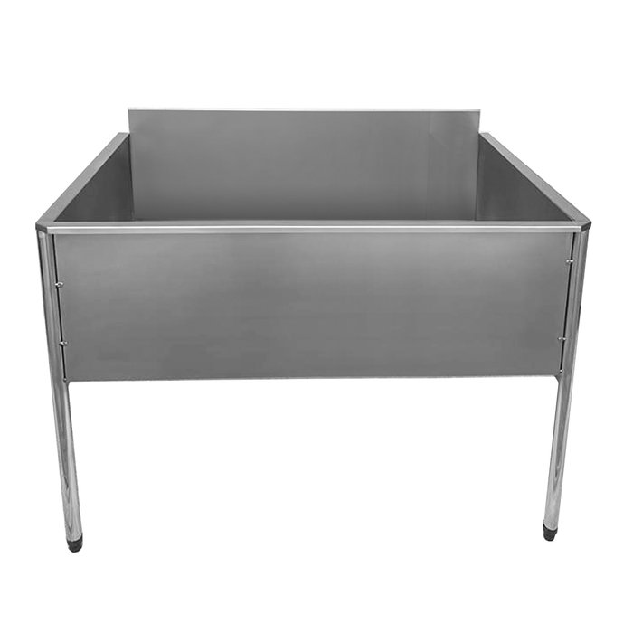 Tanque Pia totalmente em Aço Inoxidável 201, medindo 1,40 metros de comprimento, 75 cm de largura e 90 cm de altura. Com cuba de 1,32 metros de comprimento, 71 cm de largura e 45 cm de altura. Espelho frontão de 10 cm, responsável pela prevenção de respingos na parede.