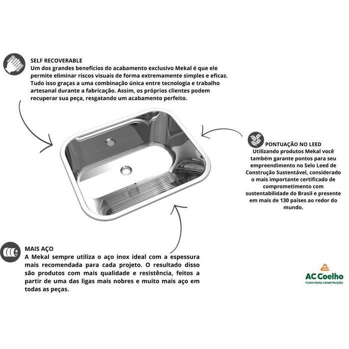 SEM TRATAMENTO ANTI-RUÍDO O aço da Mekal passa por uma série de processos até sua peça ficar perfeita. Sem nenhum ruído ou estalo. Por isso, não tem a necessidade de compensar o barulho com algum tipo de emenda indesejada, como borrachas embaixo das cubas, encontradas em alguns produtos do mercado. Esse cuidado na fabricação reafirma nosso compromisso com a qualidade. DURABILIDADE ESTENDIDA Sua peça Mekal atravessa gerações, mantendo a qualidade e consistência. Basta conservá-la com produtos indicados para aço inox. Além disso, estamos totalmente a seu dispor para o que você precisar.