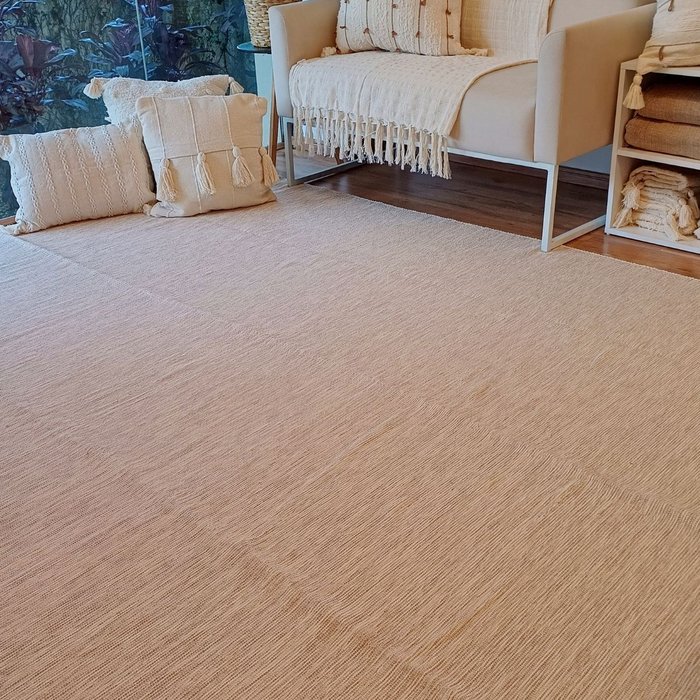 Produzido manualmente em tear artesanal com 100% algodão natural, esse tapete combina fios em tons de nude mesclado que remetem à serenidade da terra, da pele e da luz suave. Seu visual limpo e sua textura fina criam uma base acolhedora que traz equilíbrio e calma aos espaços.