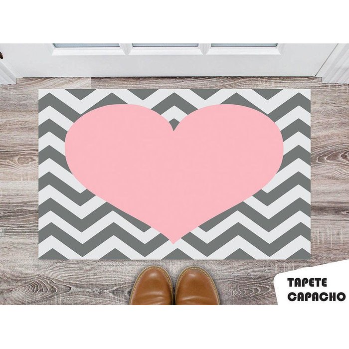 Tapete Capacho Personalizado Coração Rosa, Fundo Listrado Cinza e Branco