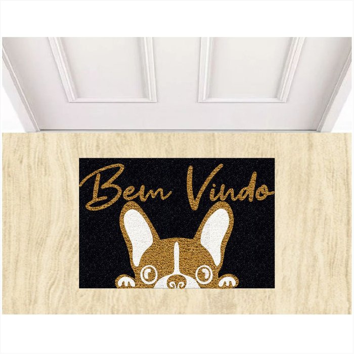 Tapete Capacho Vinil Bem Vindo Bulldog Pets para Decoração.:preto