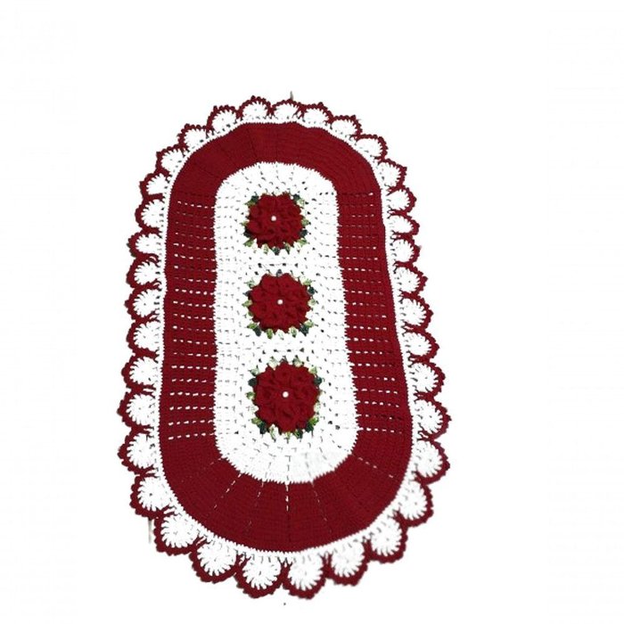 Tapete Crochê Oval Sala Quarto Flores Branco Vermelho 69x50
