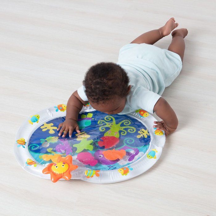O Tapete de Água Inflável da Buba e perfeito para o bebê brincar de bruços com conforto. Além de ajudar a fortalecer os músculos, possui elementos internos que se movimentam, ideais para estimular os sentidos do pequeno.