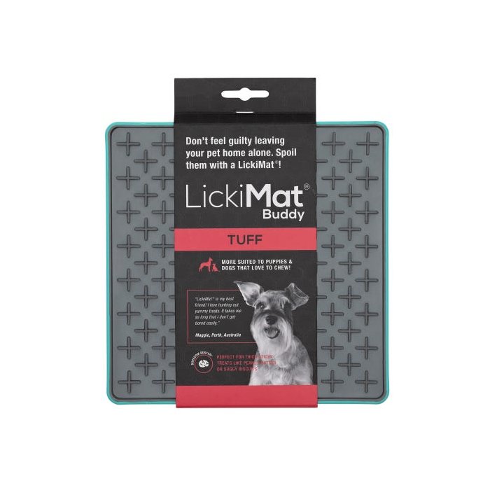 LickiMat Tuff Series - Buddy é um alimentador desenvolvido por veterinários que temo objetivo de divertir, reduzir o estresse, ansiedade e tédio de seu cão. Reduz a velocidade de ingestão de alguns segundos para alguns minutos. Feito com uma bandeja de plástico rígido e borracha, possui um design indicado para cães que adoram morder.