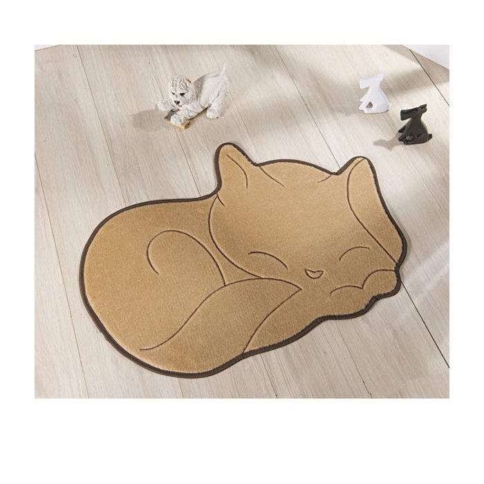 Tapete de Pelúcia Infantil Bege Gato Soneca Bege 88cm x 62cm Antiderrapante
