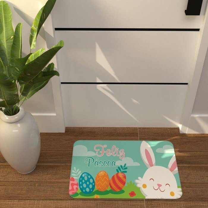 Tapete Decorativo Emborrachado Feliz Páscoa Coelho e Ovos Coloridos - 60x40 cm -