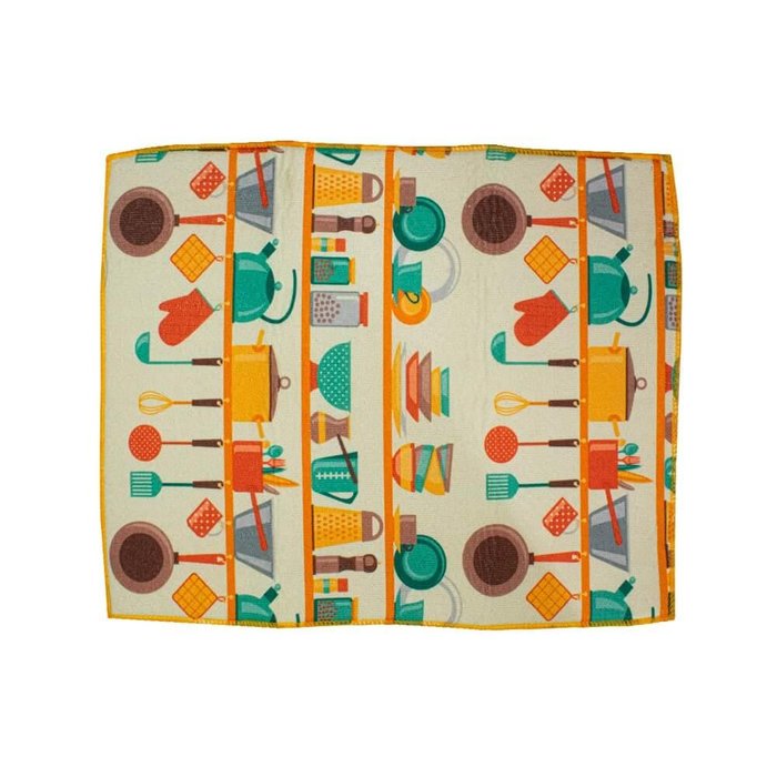 O Tapete Escorredor de Louças da Casambiente é feito de microfibra, material extremamente macio, confortável e ultra absorvente. Possui a parte externa feita 100% em poliéster e enchimento interno de poliuretano, e pode absorver até 4 vezes o seu peso em água. Possui lindos desenhos de utensilios de cozinha para decorar ainda mais seu ambiente, e base e bordas na cor laranja