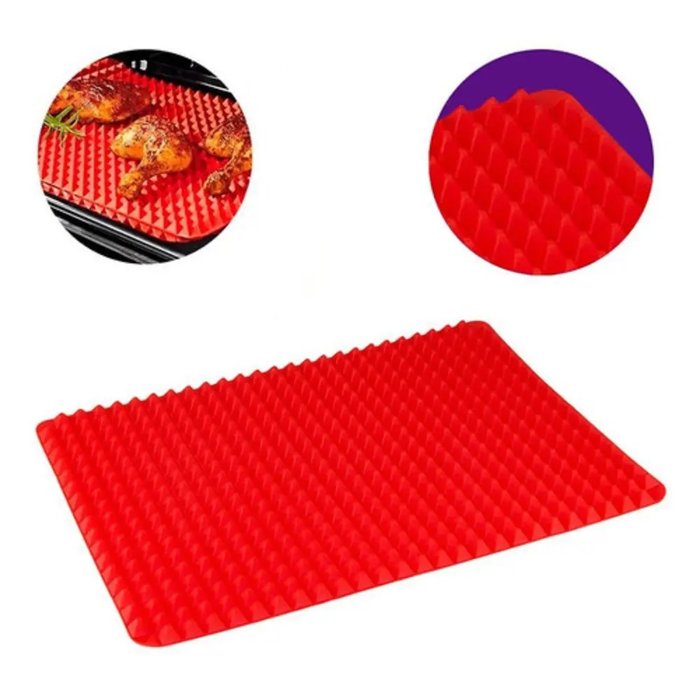 Tapete Esteira de Silicone Culinário Forno Antiaderente Esse tapete de silicone com pirâmides para que a gordura escorra e facilite o ar quente circular por baixo dos alimentos, e assim cozinhando os dois lados ao mesmo tempo.Elimine a gordura de seus alimentos de uma maneira simples. ESPECIFICAÇÕES: - Dimensões da Peça: 30 x 40 x 1cm - Vai em forno, microondas e freezer - Material: Silicone - Cor: Vermelho - Tipo de Embalagem: Caixa litografada PRECAUÇÕES DE USO: - Evite o contato com as chamas. - Não dobre ou puxe este produto além do seu limite. - Não use palha de aço neste produto - O contato com o álcool, solvente de tintas ou outras substâncias voláteis, pode causar dano ao seu produto. - Evite deixá-lo á luz do sol. CUIDADOS: - Lave com detergente neutro e enxágue com água limpa em abundância. - Para secar, utilize um pano seco e macio. - Evite o uso de produtos abrasivos.