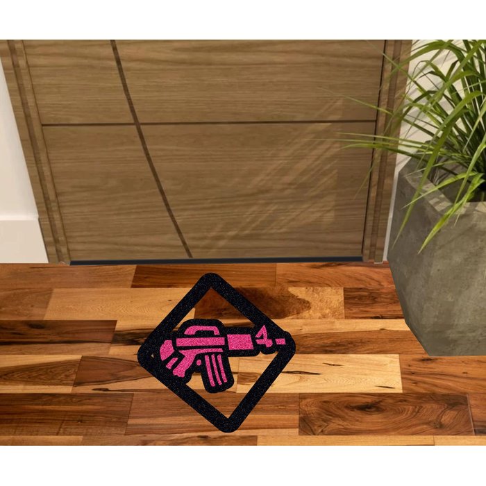 Tapete tipo Capacho Vinil com fibras entrelaçadas e costado emborrachado com arte pinta em tinta vinílica especial.