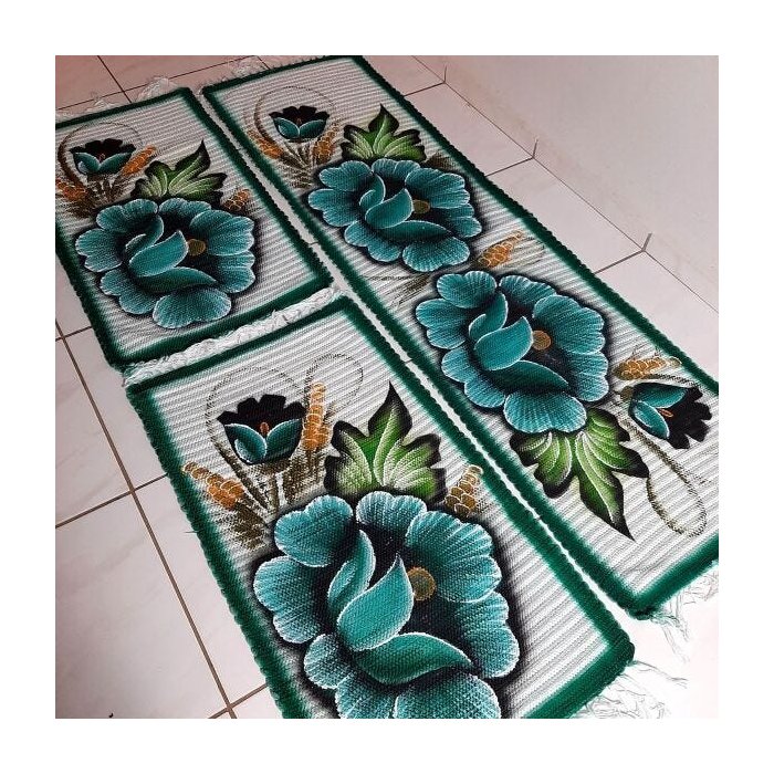 Tapete para Cozinha Tear Kit 3 Peças Pintado Flor Verde 04