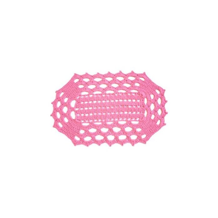 Tapete Angel em crochê oval feito de barbante e crochetado, na cor rosa medindo 0,50 cm de comprimento e 0,40 de largura.