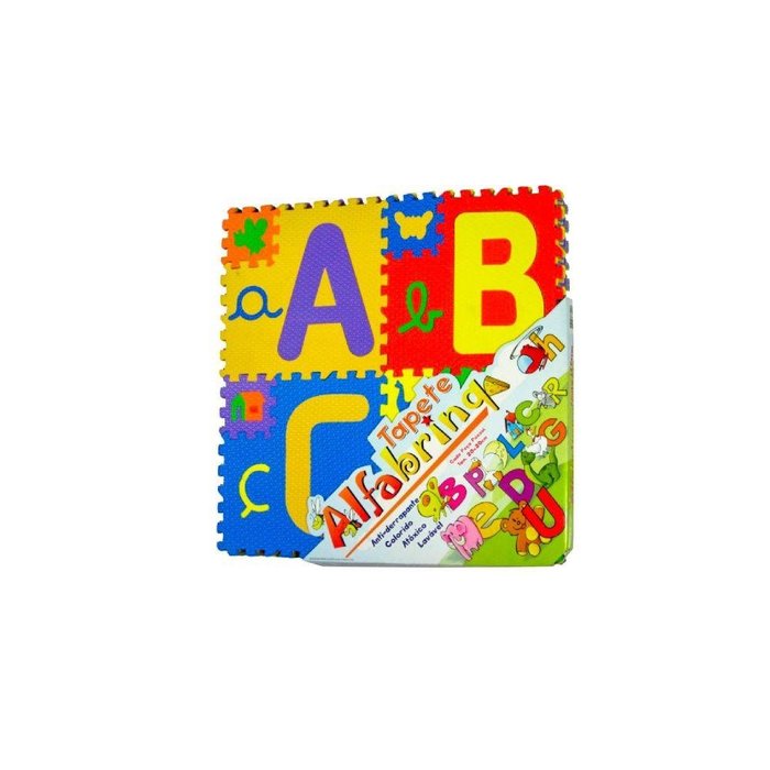 Tapete Alfabeto 28 placas - Tapete emborrachado colorido composto por 28 peças. Cada placa mede aproximadamente 20 x 20 cm e 8 mm de espessura, cobre uma área aproximadamente de 1,80m x 80cm. O Tapete do alfabeto é confortável, macio, atóxico, colorido, resistente, inodoro, lavável, anti-impacto, higiênico e excelente protetor térmico. A criança realiza associação das letras com figuras. Pode ser usado como decoração, para abafar o som e amortecer o impacto. Desenvolve a coordenação motora, organização espacial e corporal, linguagem e comunicação.