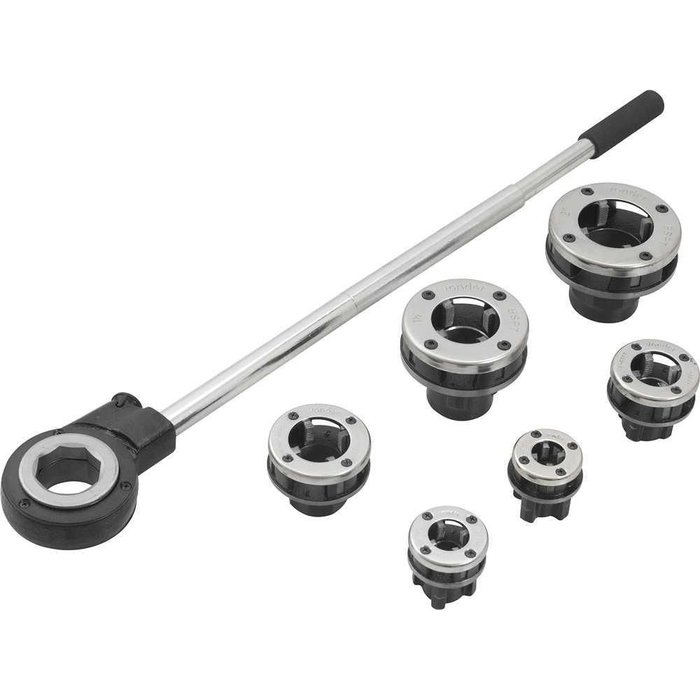 1 Jogo de tarraxas, composto por 1 maleta plástica com: 6 tarraxas BSPT (1/2", 3/4", 1", 1.1/4", 1.1/2" e 2"), 1 porta-tarraxa com catraca reversível, cabo com empunhadura e 2 prolongadores do cabo.