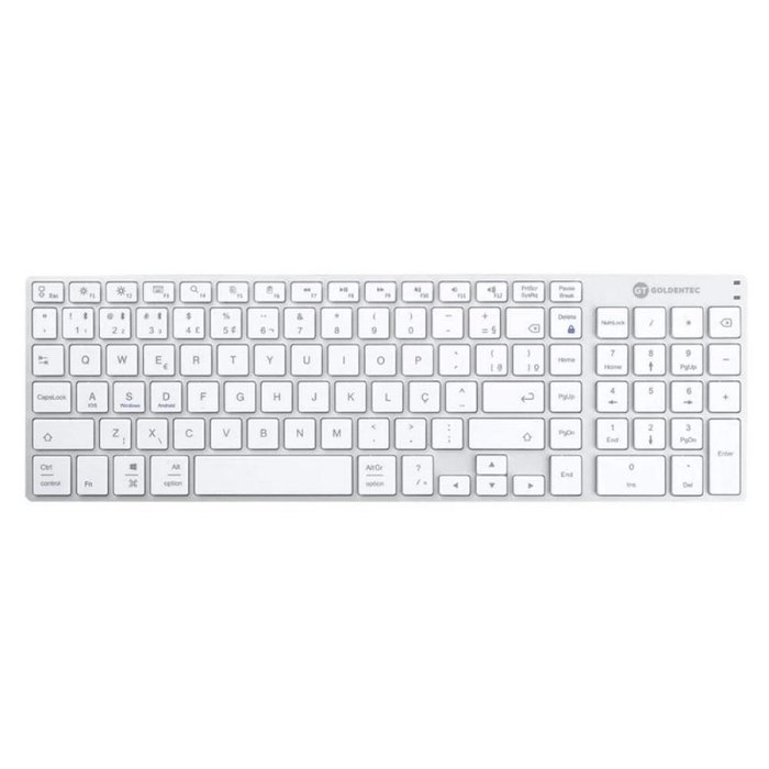 Teclado Bluetooth Aluminum GT Style | GoldentecBluetooth | Acabamento em alumínio | Conecta até 03 dispositivos | Padrão ABNT 2 | Teclado universal numérico | Teclas macias, base antiderrapante | Compatível com Android, iOS e Windows | Conectividade simultânea com computadores, smartphones e tablets | Quantidade de teclas: 102.
