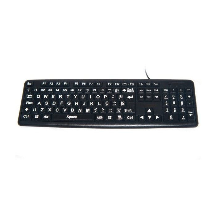 - Caracteres em acordo com ABNT (Normas Técnicas para Textos e Escrita em Braille) 3º Edição de 2018 - Ideal para pessoas com todos os graus de deficiência visual, idosos e não deficientes, podem se utilizar de um computador que tenha este teclado adaptado, com caracteres grandes com fundo diversos, facilita a visualização para baixa visão reduzindo a fadiga ocular e alto relevo Braille especialmente para deficientes visuais, promovendo assim maior conforto no uso diário do computador. - Seu Design ergonômico concebido para esta aplicação, tem teclas grandes com maior espaçamento entre elas macias e sensíveis ao toque que facilitam a digitação e diminuem os erros na hora de teclar um texto, acessar internet, bater papo, preenchendo formulários, entre outros. ESPECIFICAÇÕES TÉCNICAS: * Caracteres em adesivos vinílico ( 3M® ) de alta resistência ao toque e limpeza * Caracteres em Braille ampliados em alto contraste (Letras e Números) * Caracteres principais grandes aumentados em até 5 X * Permite uso de colmeia transparente (Produto vendido separadamente) * Tecla em alto contraste Amarelo e carácter Preto * Gabinete do teclado na cor preta * Layout padrão Português Brasil ABNT2 (QWERTY) * 12 teclas de funções * Ajuste de angulo de posição do teclado * Interface USB * Dimensões do teclado 43,5 Cm x 2,0 Cm x 14,2 Cm (L x A x P) * Tamanho do cabo 1,75 mts * Peso 400 Gramas