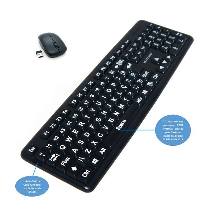 - Caracteres em acordo com ABNT (Normas Técnicas para Textos e Escrita em Braille) 3º Edição de 2018- Este teclado com teclas ampliadas em alto contraste foi adaptado especificamente para pessoas que apresentam condições que causam deficiência visual ou baixa visão. Eles também são úteis para quem trabalha em condições de pouca luz. Com caracteres grandes, sua visualização fica facilitada nos casos de baixa visão, reduzindo a fadiga ocular promovendo maior conforto no uso diário do computador.- Seu Design ergonômico concebido para esta aplicação, tem teclas grandes com maior espaçamento entre elas macias e sensíveis ao toque que facilitam a digitação e diminuem os erros na hora de teclar um texto, acessar internet, bater papo, preenchendo formulários, entre outros.