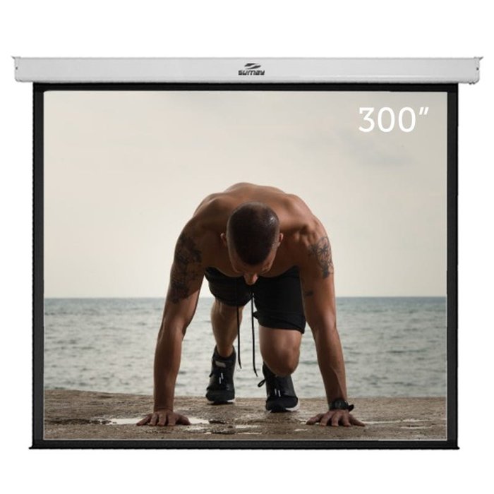 Material: Película Matte-White 1.0 com acabamento em pintura eletrostática e borda para melhor enquadramento de imagem. Botoeira para acionamento elétrico.